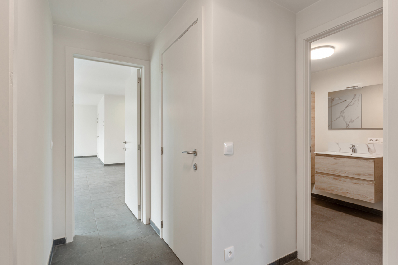 Dit prachtig nieuwbouw appartement is voorzien van een inkomhal, een grote leefruimte, een open keuken met handige berging en een ruim privé (deels overdekt) terras. De grote raampartijen zorgen voor veel natuurlijk licht. Verder zijn er 2 slaapkamers, een dressing, een badkamer en een toilet. In de ondergrondse garage is er een autostaanplaats en een fietsenberging voorzien. Het appartement maakt gebruik van de zonnepanelen en de wc's zijn aangesloten op regenwater.
