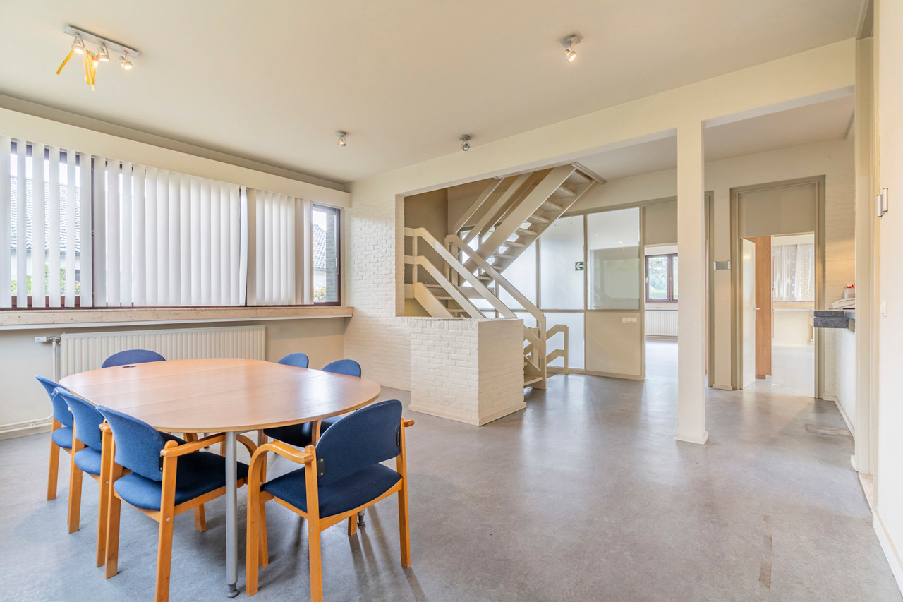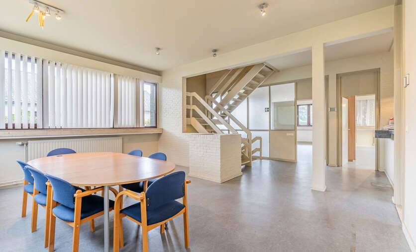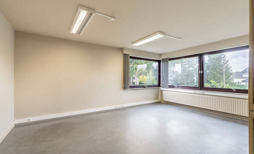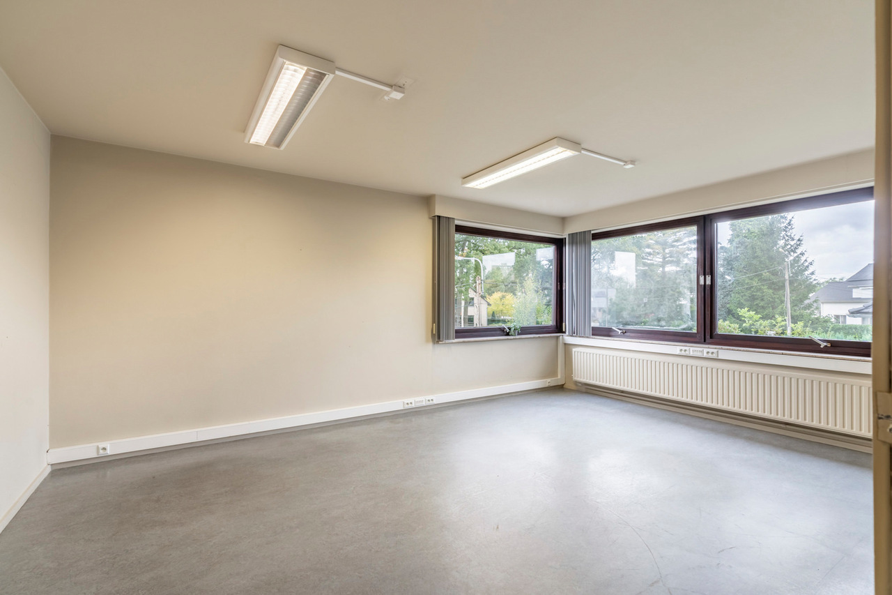 Huidige indeling: Op de gelijkvloerse verdieping is er een inkomhal, wachtzaal, toiletten, technische ruimte; op de eerste verdieping is het onthaal, een polyvalente ruimte, 2 grote burelen en een apart kantoor; op de 2de verdieping is er kitchenette, een toilet en verschillende individuele ruimtes. Via een uitschuifbare ladder kom je op de niet afgewerkte zolderverdieping.