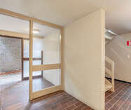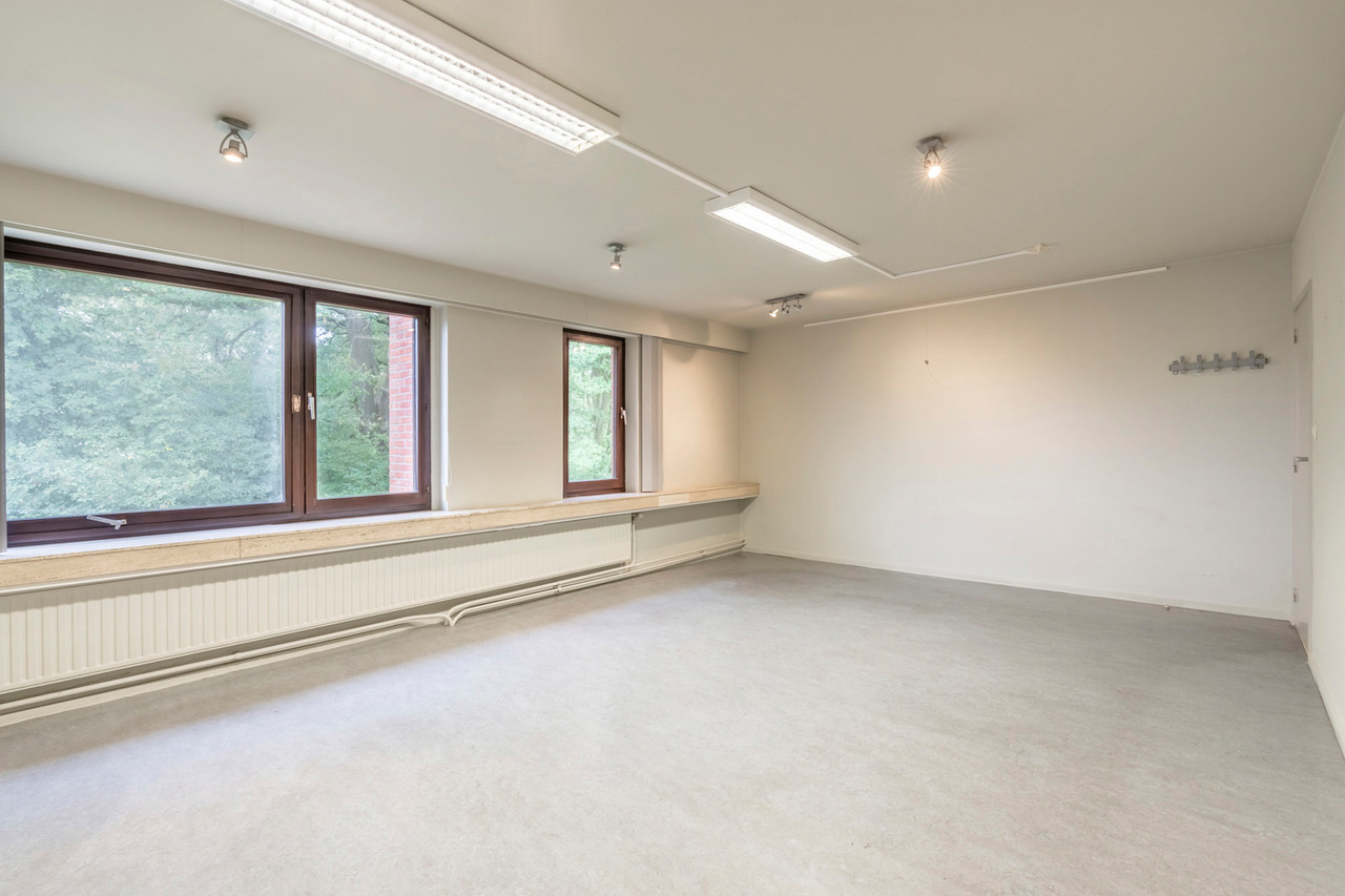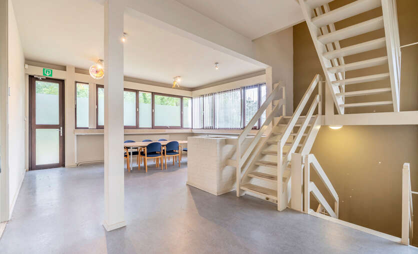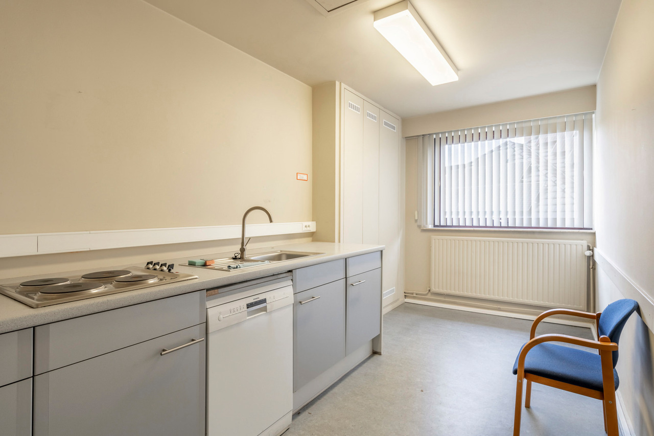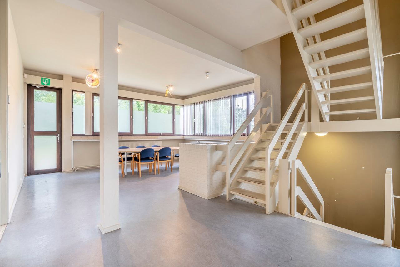 Huidige indeling: Op de gelijkvloerse verdieping is er een inkomhal, wachtzaal, toiletten, technische ruimte; op de eerste verdieping is het onthaal, een polyvalente ruimte, 2 grote burelen en een apart kantoor; op de 2de verdieping is er kitchenette, een toilet en verschillende individuele ruimtes. Via een uitschuifbare ladder kom je op de niet afgewerkte zolderverdieping.