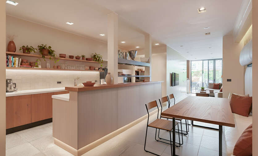 De gelijkvloerse verdieping bestaat uit een grote leefruimte met open keuken en berging. Via een groot harmonicaraam kom je uit op het ruim terras en stadstuin. Verder is er een aparte sanitaire ruimte voorzien en een mooie inkomhal met originele vloer.
