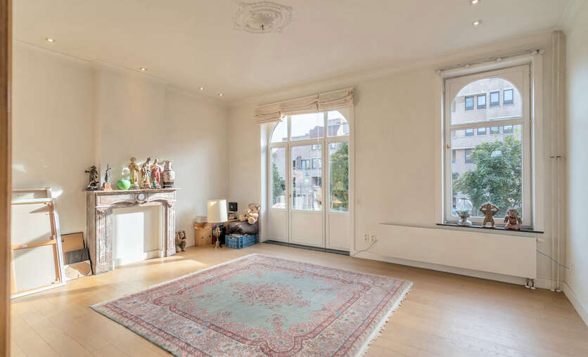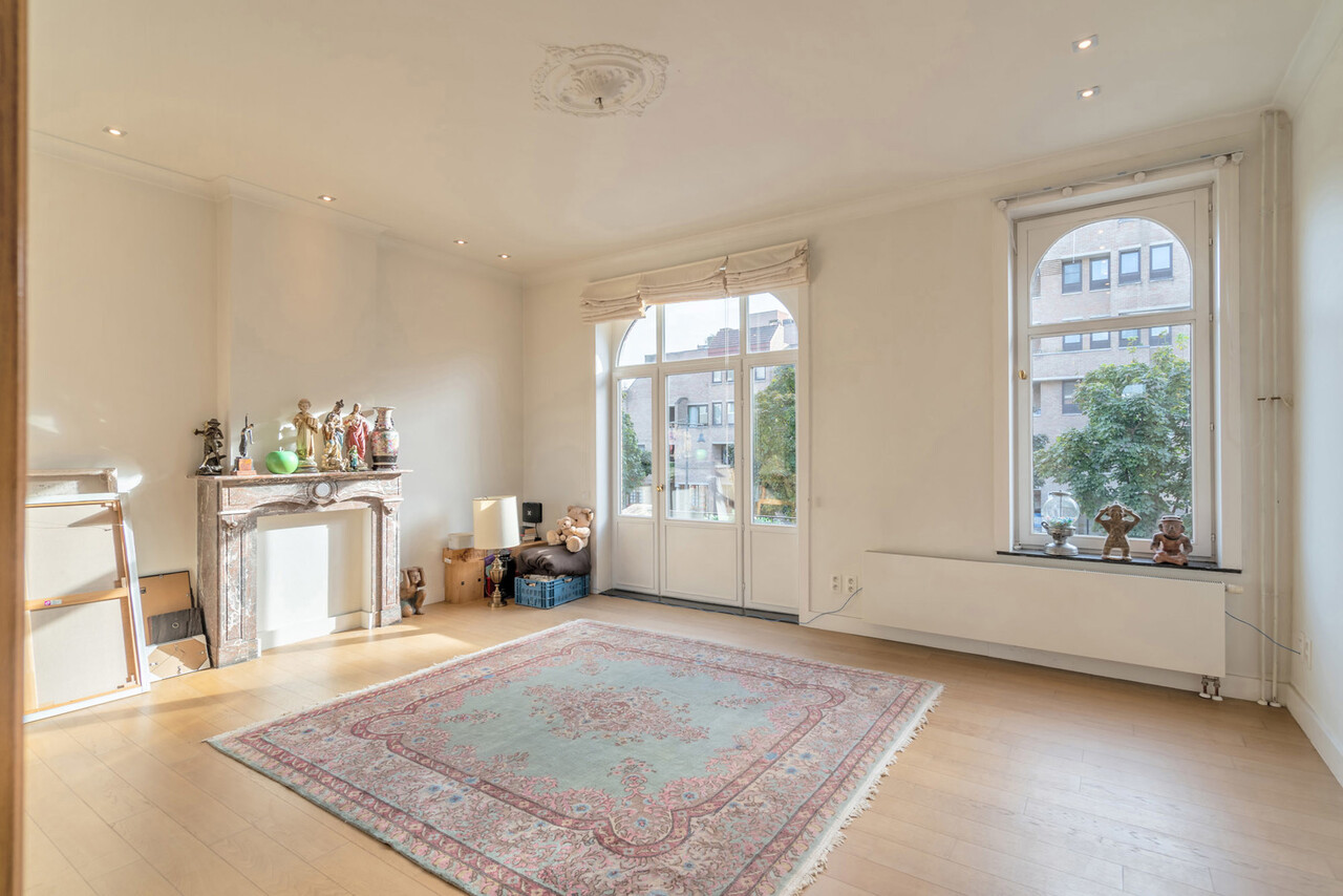 Op de 1ste verd. bevindt zich een prachtige grote ruimte met ook hier de kenmerkende hoge plafonds, een authentiek balkon aan de voorzijde en een ruim dakterras aan de achterzijde. Op een eenvoudige manier kan deze ruimte omgevormd worden tot 2 grote slaapkamers (3 indien nodig).