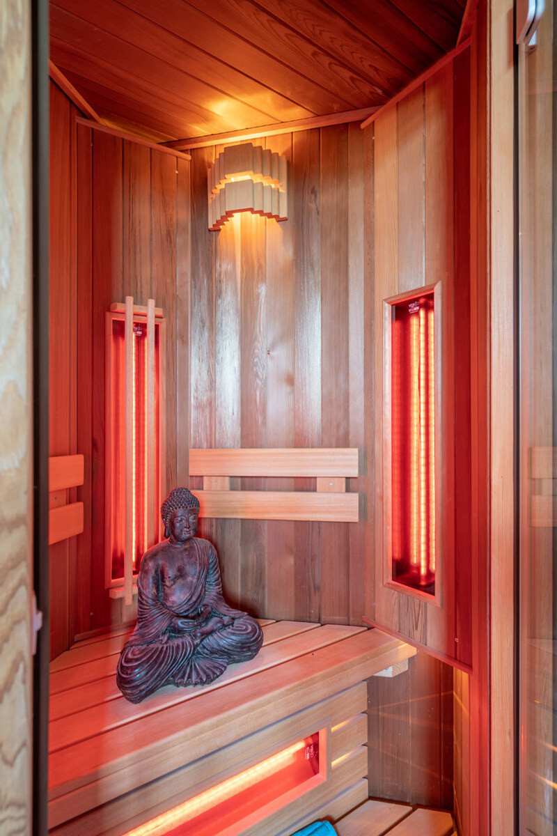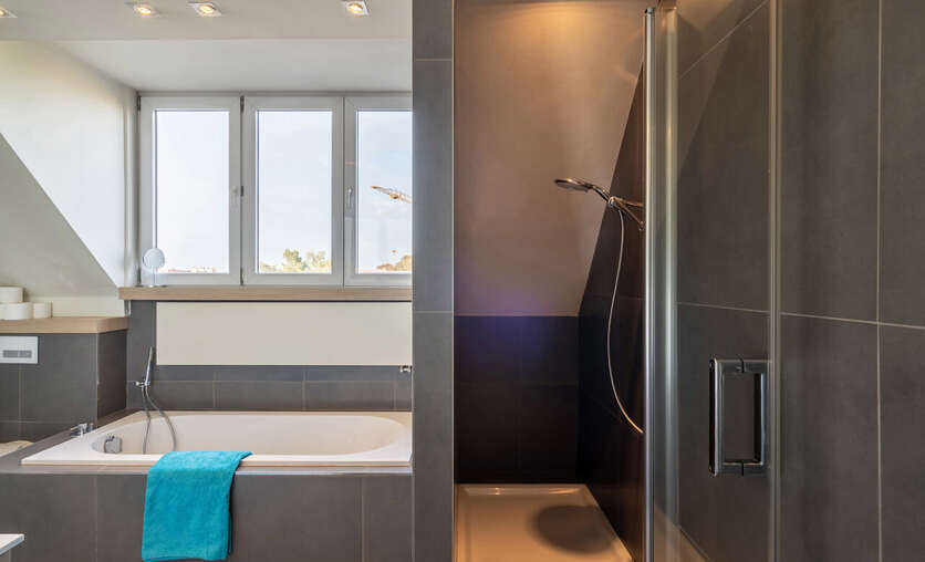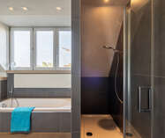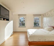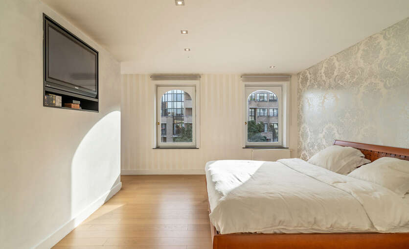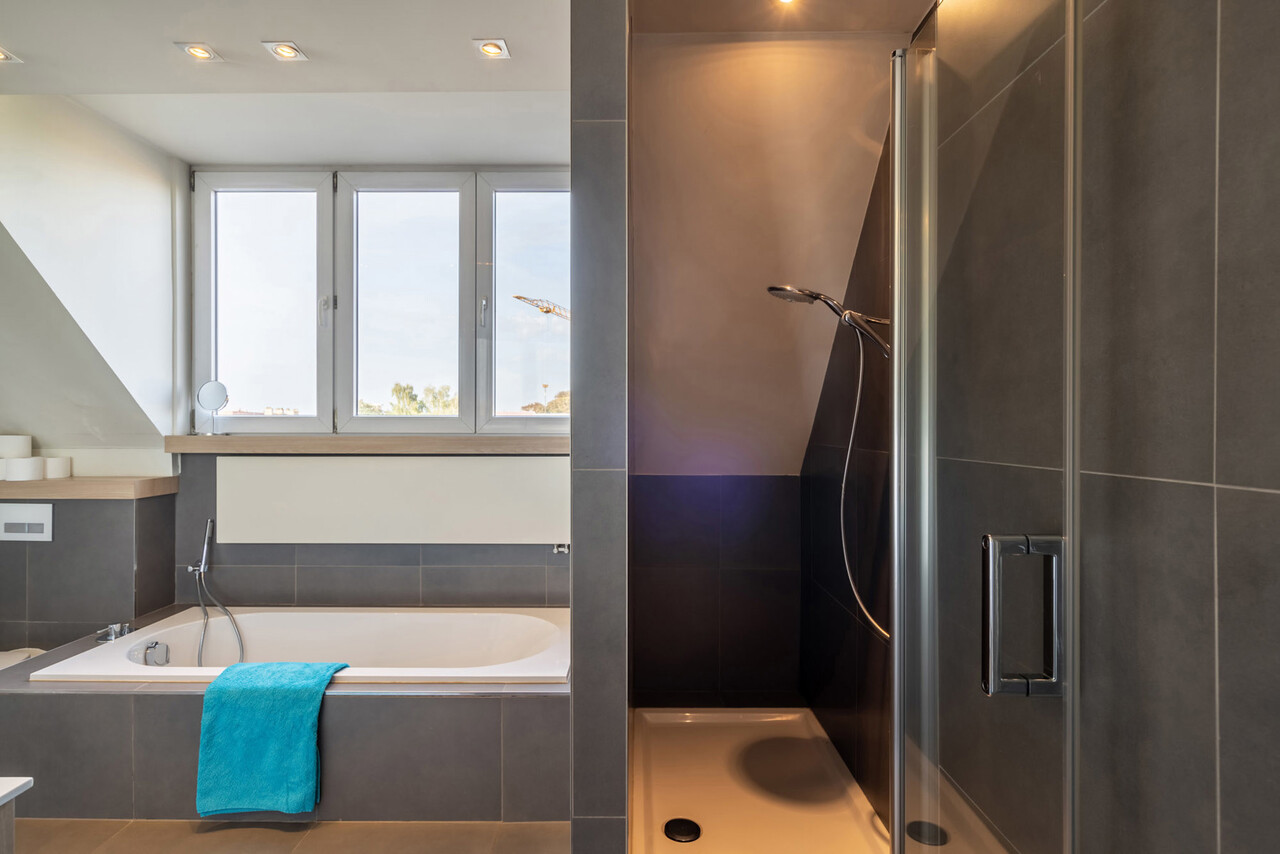 De 2de verd. is omgevormd tot master bedroom met dubbele dressing en badkamer voorzien van toilet, ligbad, inloopdouche en infraroodcabine.