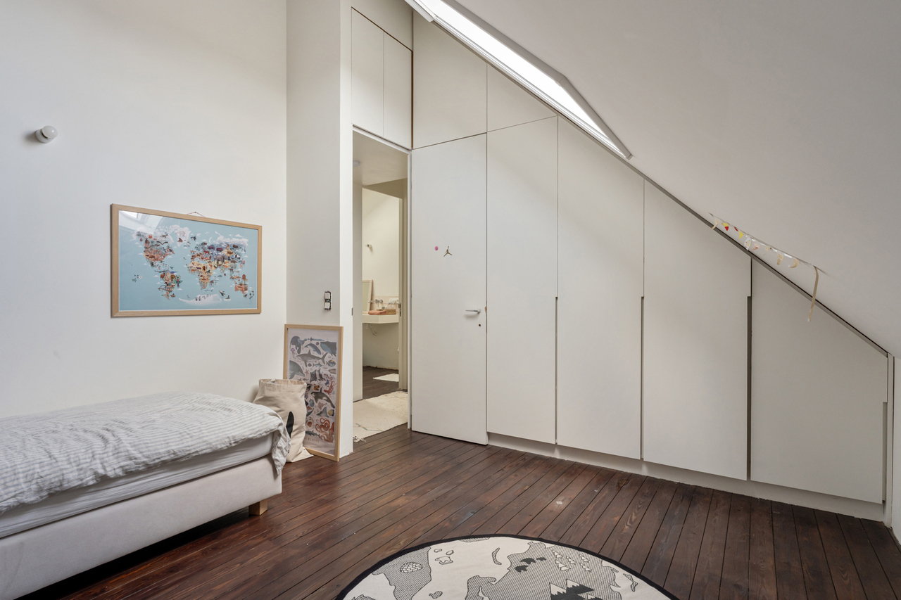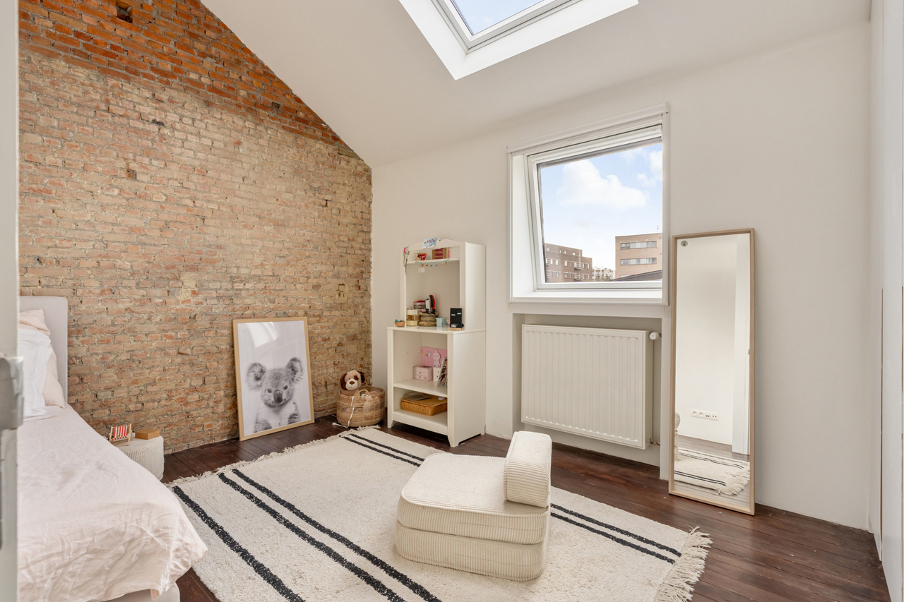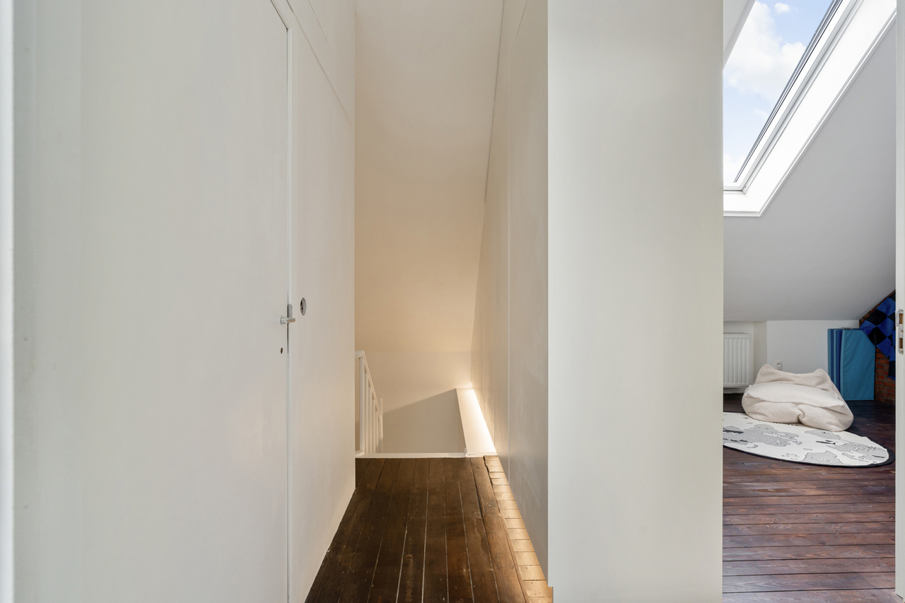 Op de eerste verdieping zijn er 2 zeer ruime slaapkamers (waarvan er momenteel 1 dienst doet als dressing), een bureau/kinderkamer en een badkamer voorzien van inloopdouche, lavabomeubel en toilet. Op zolderverdieping werd volledig gerenoveerd/omgebouwd tot 2 mooie slaapkamers en een badkamer met ligbad, lavabomeubel en toilet. Verder zijn er grote inbouwkasten voorzien zodat er voldoende opbergruimte is. De veluxramen beschikken over screens aan de buitenzijde.