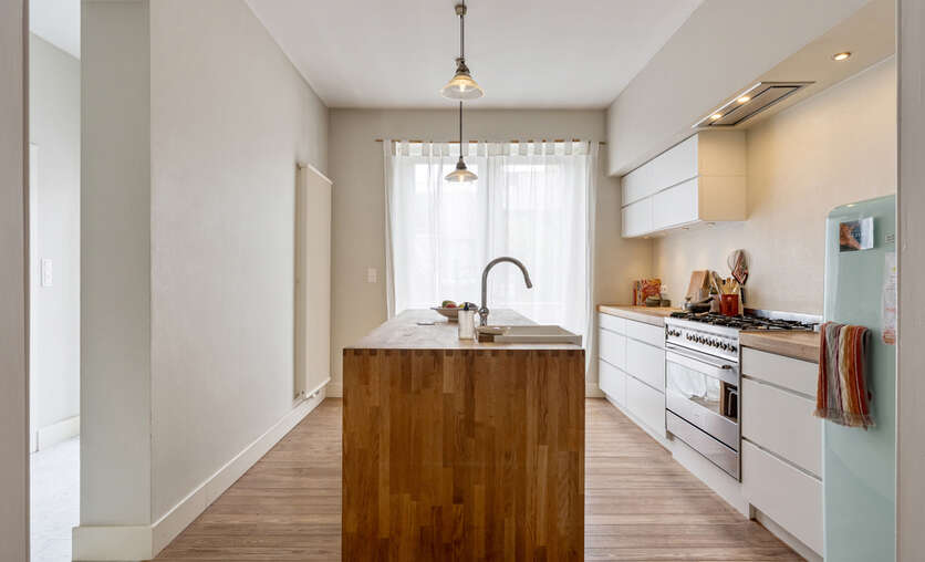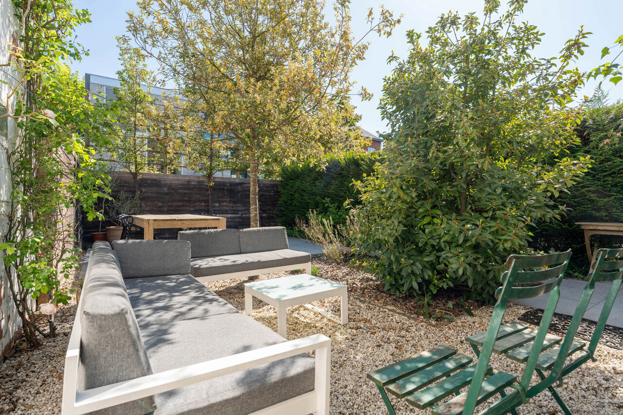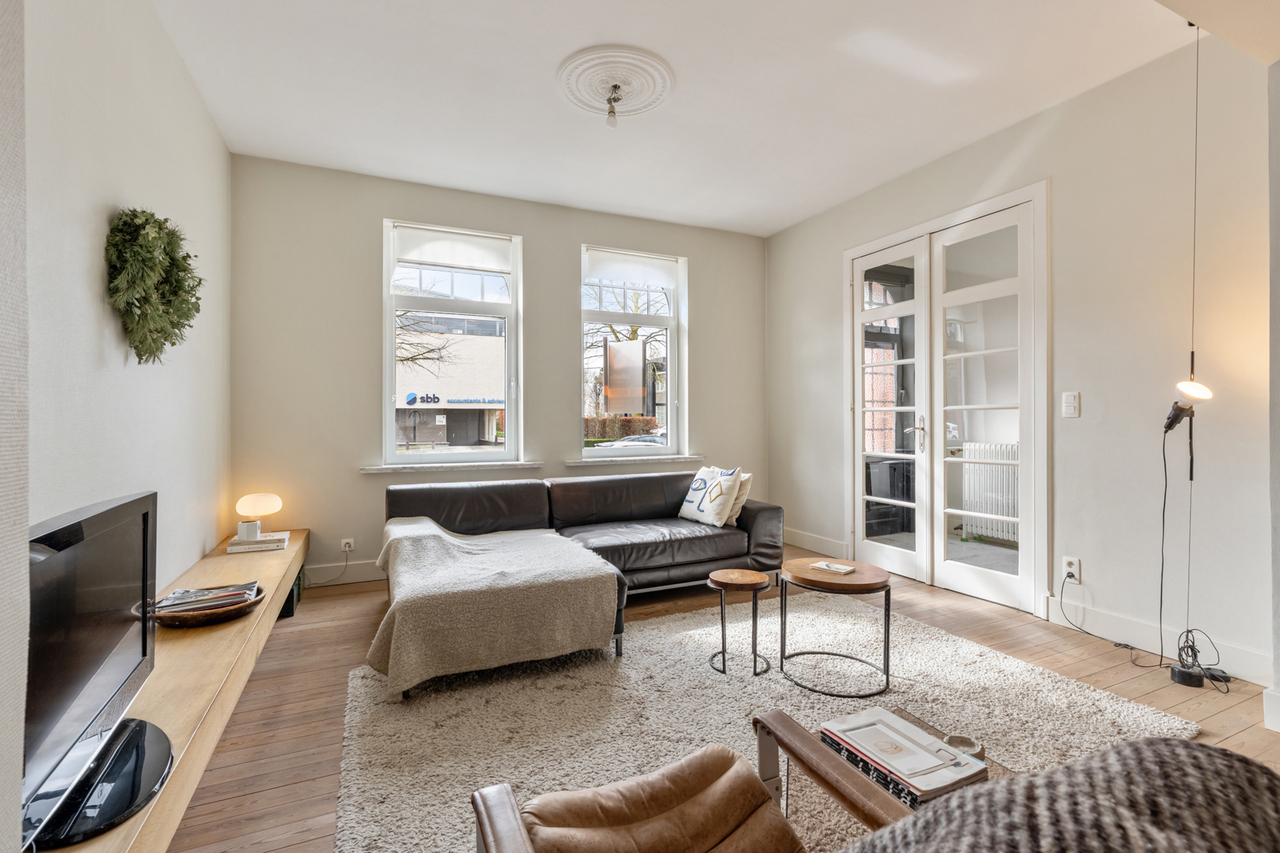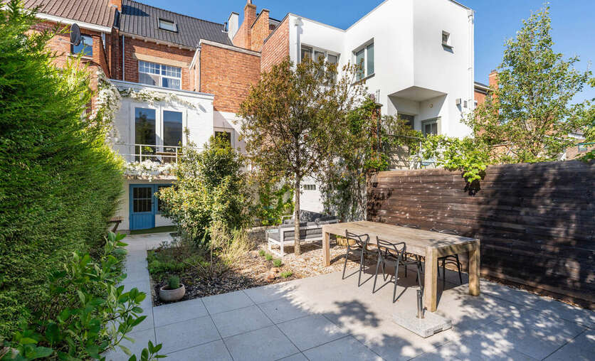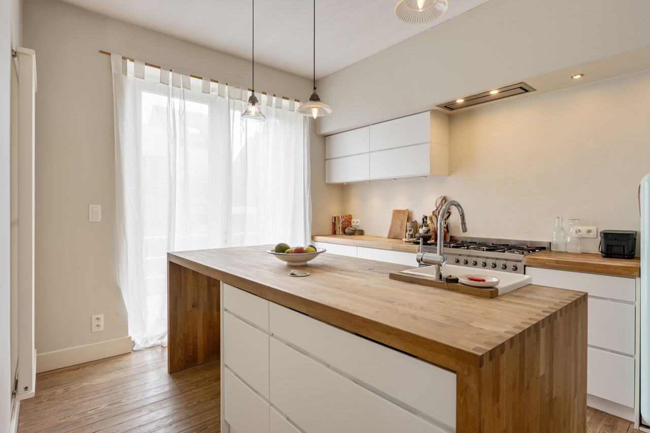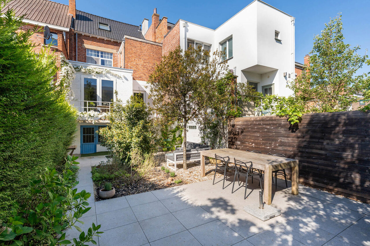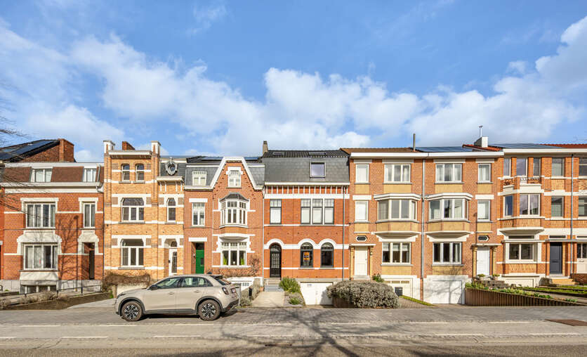 Deze woning werd gebouwd in de jaren 30 en volledig gerenoveerd in 2012. De grote raampartijen zorgen voor veel natuurlijk licht. De inkomhal is voorzien van een marmerenvloer. Via een dubbele deur met glasramen kom je in de leefruimte. Deze kan afgescheiden worden van de keuken d.m.v. een driedubbele deur met glasramen. Zowel de leefruimte als de keuken (volledig geïnstalleerd met SMEG gasfornuis) zijn voorzien van parket vloerbekleding. De hoge plafonds zorgen voor een zeer ruimtelijk gevoel. Via een dubbele glazen deur kom je op het verhoogd terras. De trap biedt toegang tot de aangelegd stadstuin.